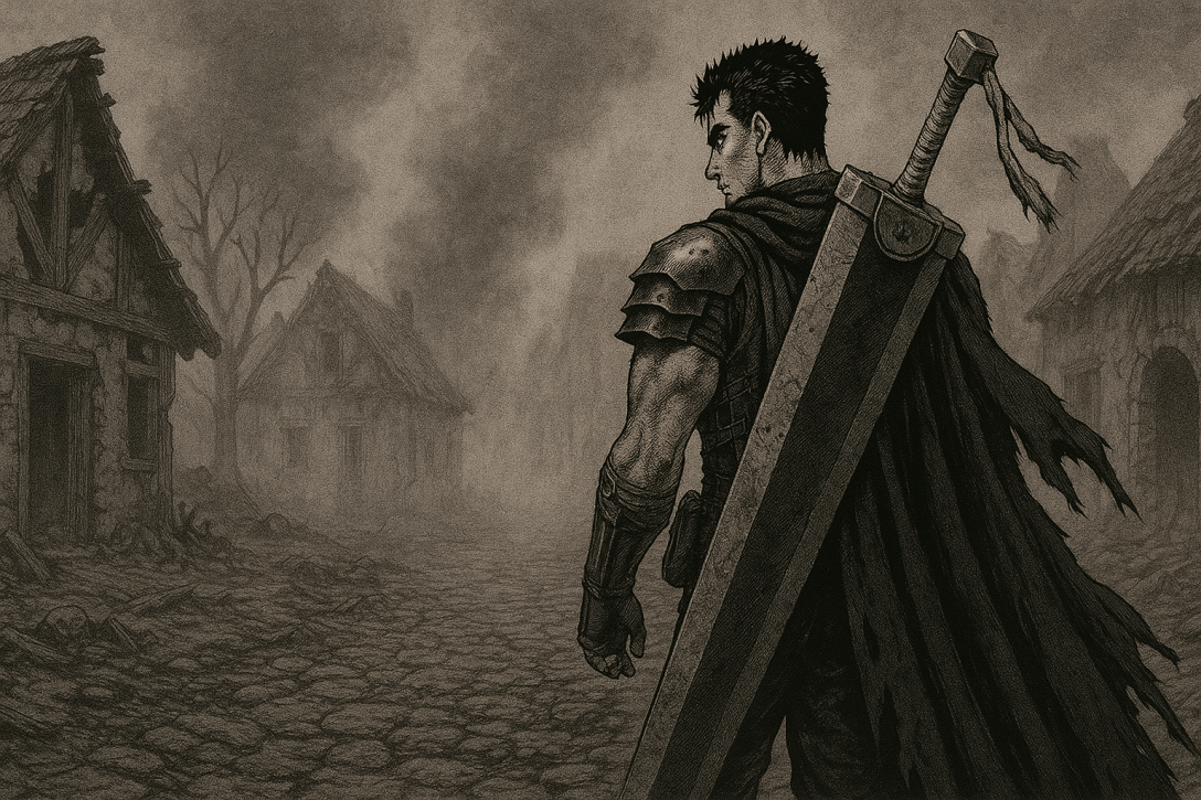 The sun never rose. Only a dim, sickly light seeped across the wasteland, coloring the world in bruised shades of gray. Guts trudged onward, his armor clanking with each step, weighed down not just by the steel but by the unseen hands of everything he had killed — everything he had lost. In the corner of his vision, the shadows moved when they should not. Shapes curled at the edges of the dead trees, watching him without eyes.